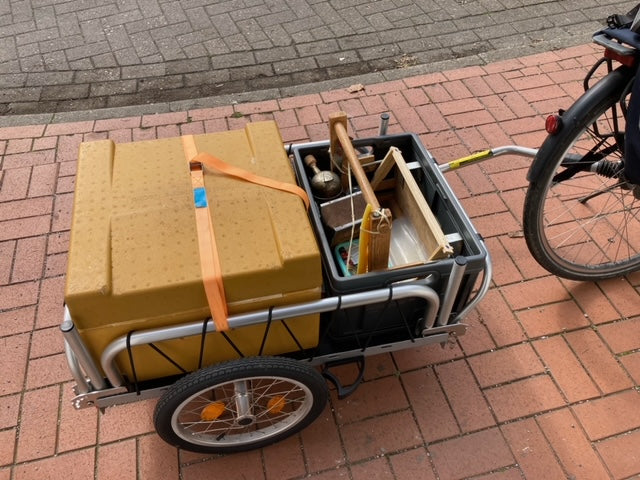 We mostly go out with him to collect trash and dispose of it properly. The employees at the recycling center already know us as "the two girls with the green bike trailer who always bring trash out of the forest."